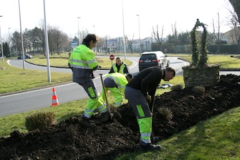 Le lundi 4 mars, tandis qu’une équipe terminait sa tournée hebdomadaire de ramassage des végétaux, les autres agents redoublaient d’énergie dans leur secteur d’intervention, arc-boutés sur leur fourche, bien repérables avec leurs baudriers jaune fluorescent. Un vaste travail les attendait pour aérer la terre tassée par les différentes périodes de pluie, de neige et de gel. Cette opération de bêchage manuel est un préalable à l’amélioration du sol, avec l’apport de terreau et le modelage au motoculteur, juste avant les plantations qui auront lieu fin avril. Même les pourtours d’arbres d’alignement ont été intégrés dans leur programme de désherbage et bêchage. Quelle n’a pas été leur surprise néanmoins, quand pour la quatrième fois de l’hiver, à la mi-mars, ces agents de l’environnement ont été mobilisés pour déneiger et saler les chaussées, devant faire face à un nouvel épisode de neige et verglas ! Dans ces conditions particulières, le planning d’entretien des espaces verts a subi quelques révisions. Mais dès que la météo le permet, ce sont ces mêmes travaux de préparation du sol qu’ils poursuivent, et les grandes étendues de pelouse qu’ils devront aussi bientôt tondre. Déjà les équipes discutent des nouveautés prévues cette année pour les aménagements de massifs. « Il y aura davantage de plantes de grande taille, explique le responsable du centre technique municipal, les agents auront l’opportunité de disposer ces végétaux avec un effet plus naturel. Dans chaque secteur, et pour chaque massif, les jardiniers auront la liberté d’harmoniser la disposition de variétés comme notamment le bananier, la cordyline, le fuchsia sur tige, le lantana, le phornium et le dahlia. » Les bégonias, impatiens, pétunias, œillets, roses d’Inde et autres fleurs de petite taille ne manqueront pas non plus d’agrémenter les massifs et d’attirer les yeux par leurs multiples couleurs. Au total, d’ici la mi-mai, ce sont plus de 38 000 plants qui seront mis en terre par les dix-sept agents des espaces verts, pour l’embellissement de votre environnement printanier et estival.